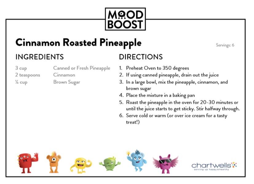 Pineapple Snack Tasting & Easy Recipe to Try at Home Chef Jillian prepared a simple pineapple recipe this week for students to sample in the cafeteria. Many students enjoyed trying this fresh fall fruit snack, and we wanted to share the recipe in case your family would like to try it at home. It’s an easy, safe way for children to explore cooking and healthy eating. We appreciate your involvement and hope your child enjoyed the tasting.