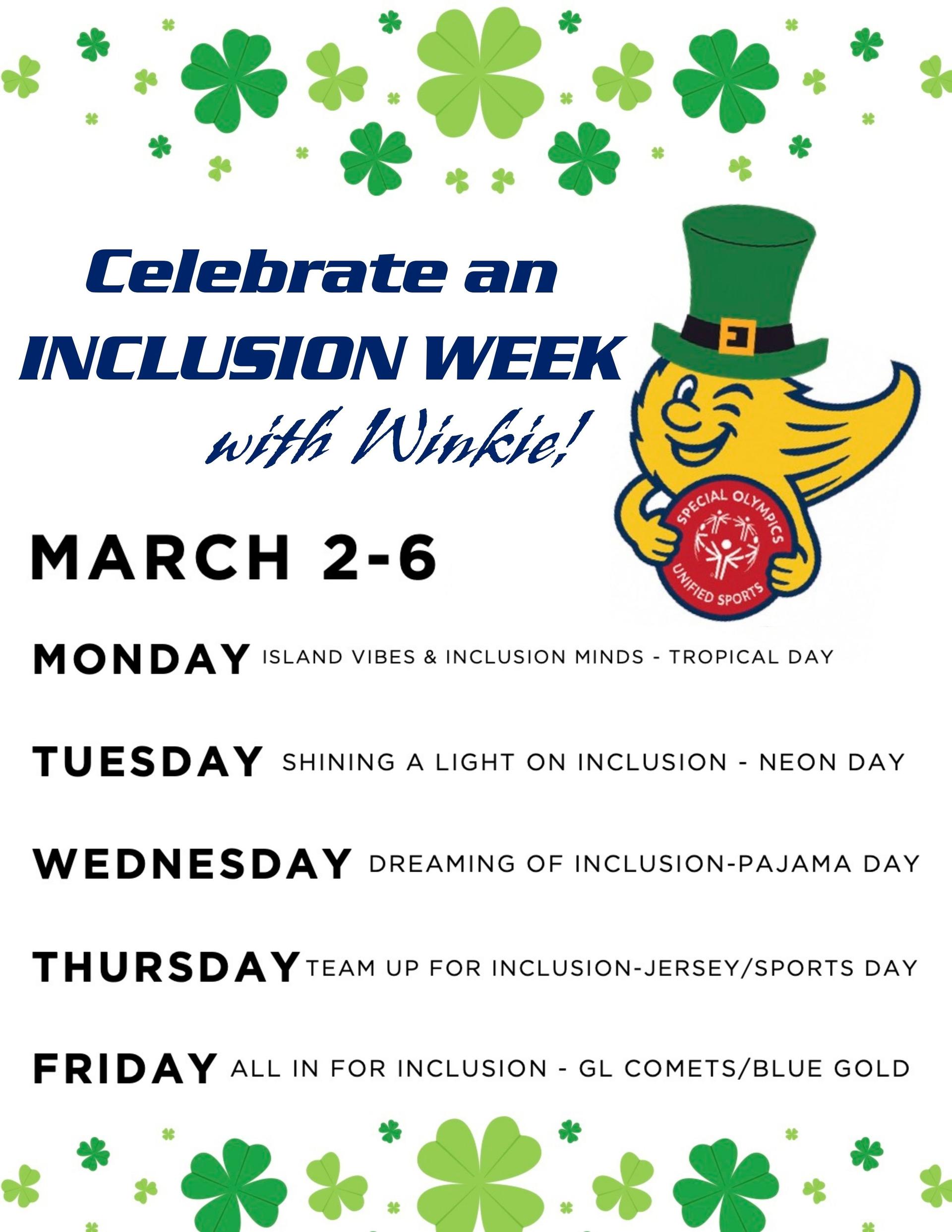 Inclusion Week Next week is Inclusion Week for GLPS. This celebration focuses on creating a school environment where all students feel seen, valued, and supported. The week promotes equity, empathy, and belonging by highlighting diverse perspectives and ensuring all students have access to quality learning. We appreciate GLHS for planning our Inclusion Week celebration.