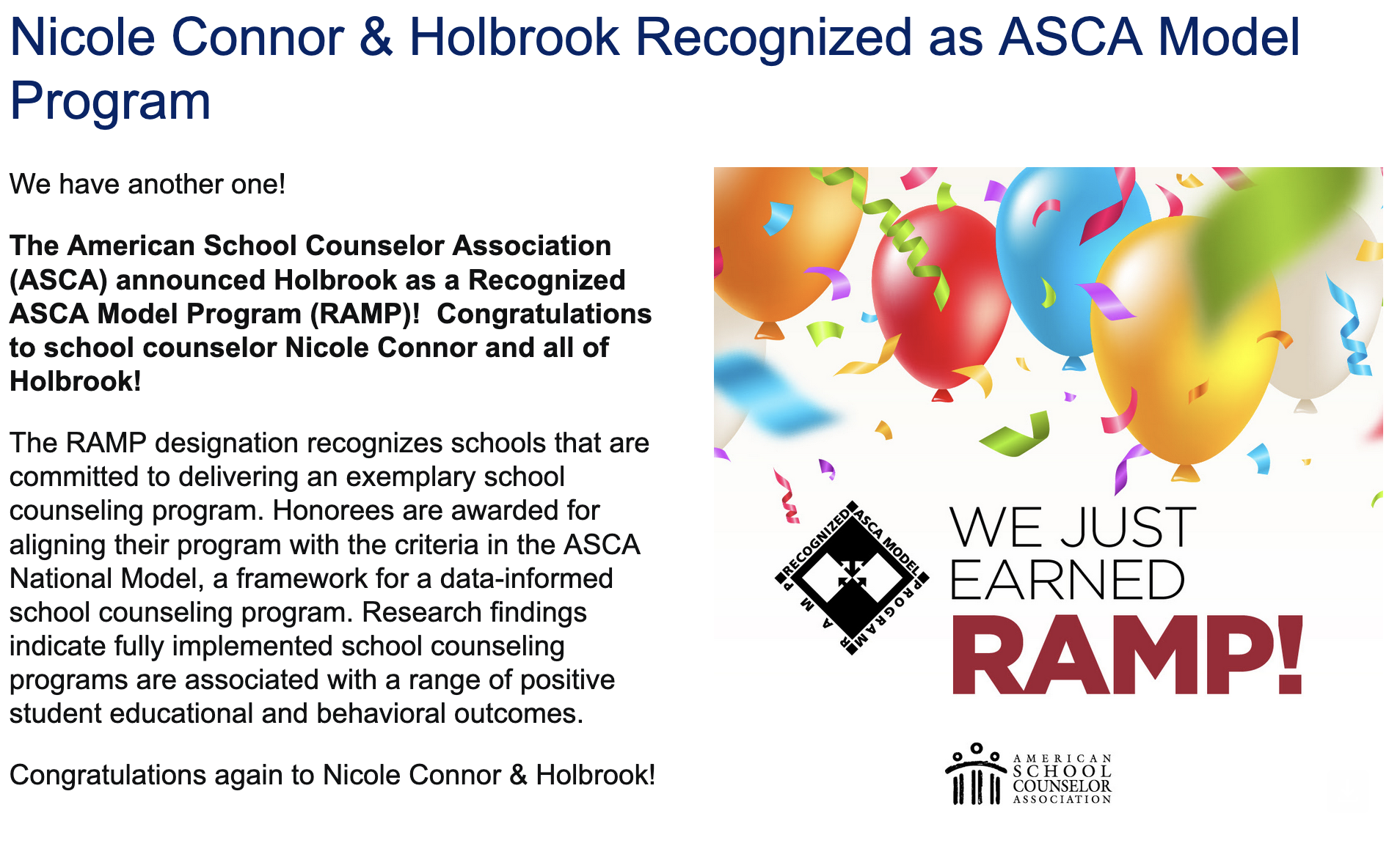 RAMP Certification Congratulations to our Holbrook counselor, Nicole Conner, on her accomplishment of leading Holbrook to becoming recognized as a RAMP certified school. This recognition affirms that Holbrook’s work aligns with the ASCA National Model and meets the highest national standards for supporting student academic achievement, social/emotional development, and college and career readiness. Nicole has spent countless hours training, working with students and collaborating with families and colleagues to meet the requirements of this certification.