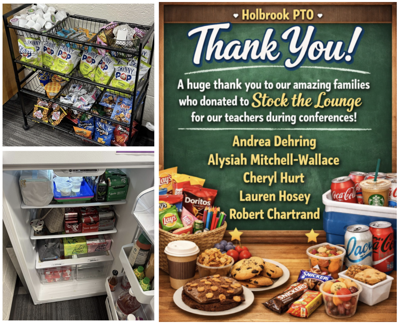 Conference Meal Donations Needed!A big THANK YOU to the wonderful families who donated items to help us Stock the Lounge for conferences this week! Your generosity helped keep our teachers fueled and feeling appreciated during long days. We are so grateful for your support!