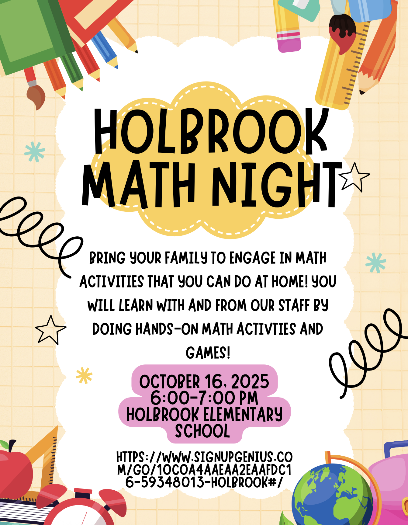 The next PTO meeting of this school year, will be held tonight, Thursday, November 6, 2025. All meetings are held in the Holbrook Library at 6pm. There is a virtual option to attend posted on the PTO Facebook page the day of the meeting. Any staff member, parent, guardian, caregiver or grandparent of a student at Holbrook is automatically a member of the PTO at no cost or obligation. Even if you do not have a lot of time to volunteer, there are many ways to help contribute to the PTO.